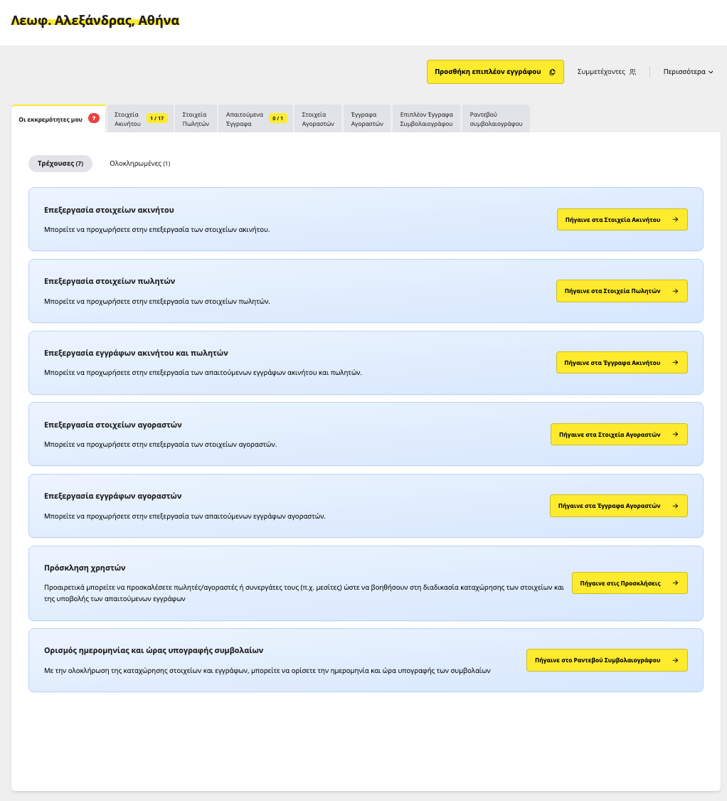 ℹ️ ΣΗΜΕΙΩΣΗ: Αν θέλετε κάποιος συνεργάτης σας ή ο πελάτης σας να προχωρήσει στην καταχώρηση στοιχείων & εγγράφων μπορείτε πάντα να τον προσκαλέσετε στην αγοραπωλησία. Δείτε το άρθρο Συμμετέχοντες.