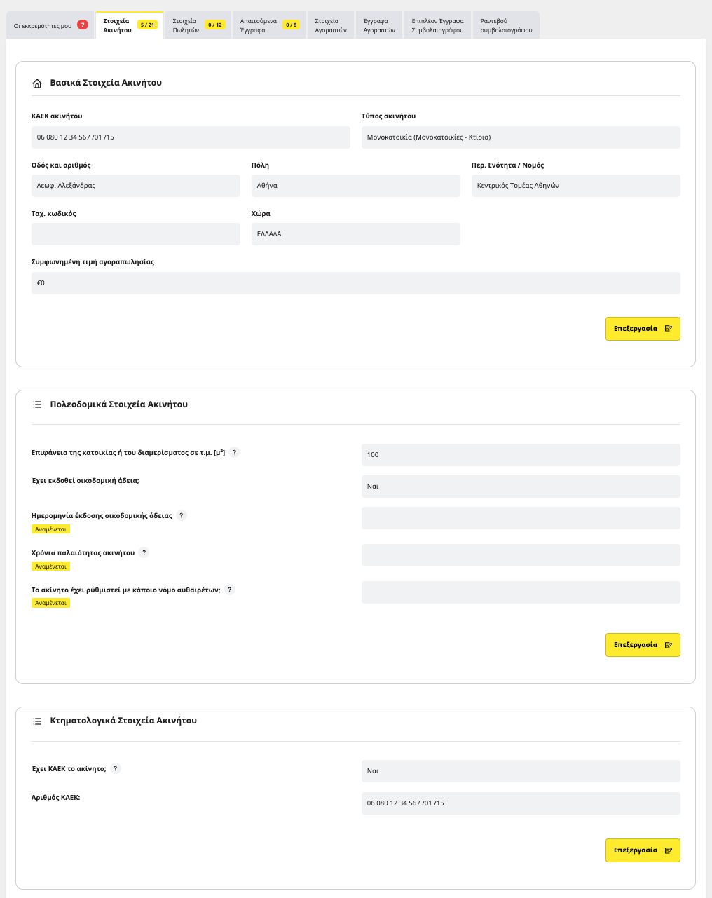 ℹ️ ΣΗΜΕΙΩΣΗ: Γίνεται αυτόματη καταμέτρηση σε πραγματικό χρόνο όλων των στοιχείων ή εγγράφων που λείπουν ή που έχουν ήδη συμπληρωθεί, για να ξέρετε ανά πάσα στιγμή όλες τις εκκρεμότητες αλλά και σε ποιο στάδιο ακριβώς βρίσκεται η αγοραπωλησία σας.
