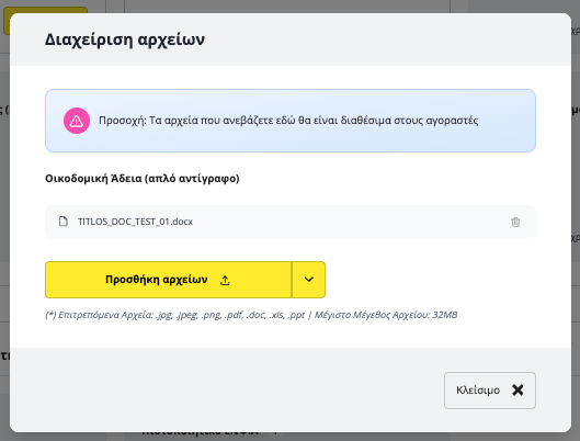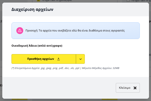 ℹ️ Επιτρεπόμενα Αρχεία: .jpg, .jpeg, .png, .pdf, .doc, .xls, .ppt | Μέγιστο Μέγεθος Αρχείου: 32MB