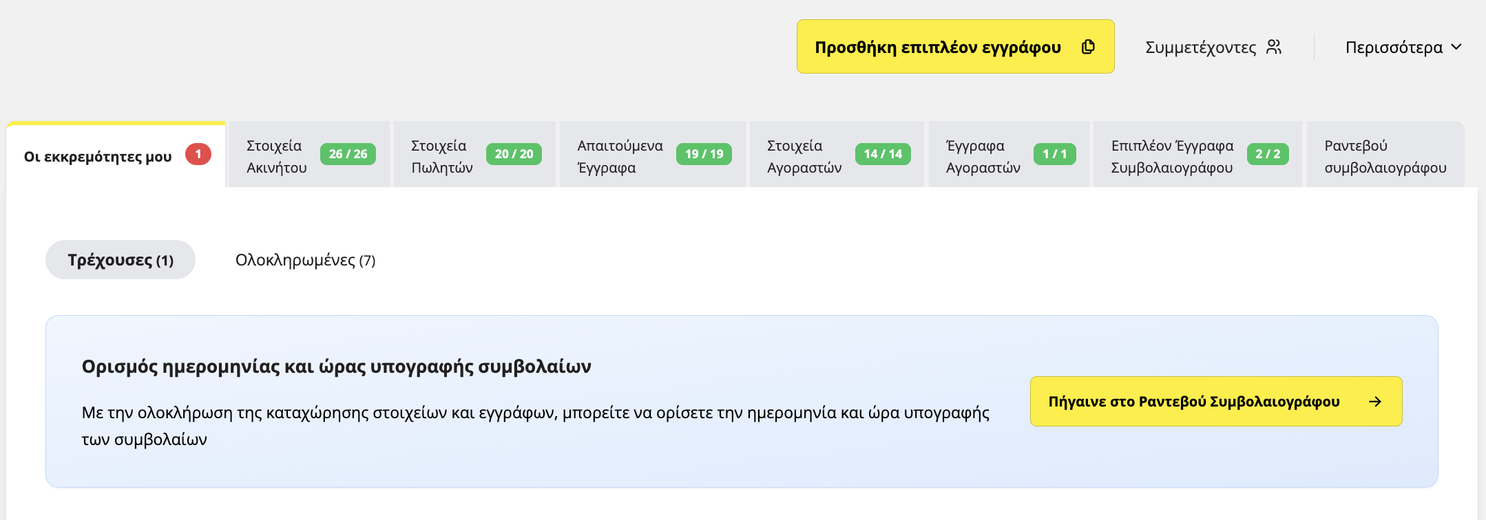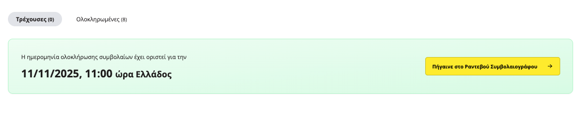 Στην αρχική οθόνη της αγοραπωλησίας θα έχει μείνει μόνο μία εκκρεμότητα, ο ορισμός ημερομηνίας και ώρας υπογραφής συμβολαίων. Για να συνεχίσετε, επιλέξτε Πηγαίνετε στο Ραντεβού Συμβολαιογράφου.