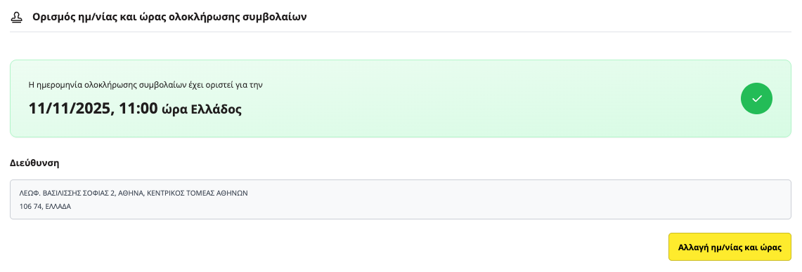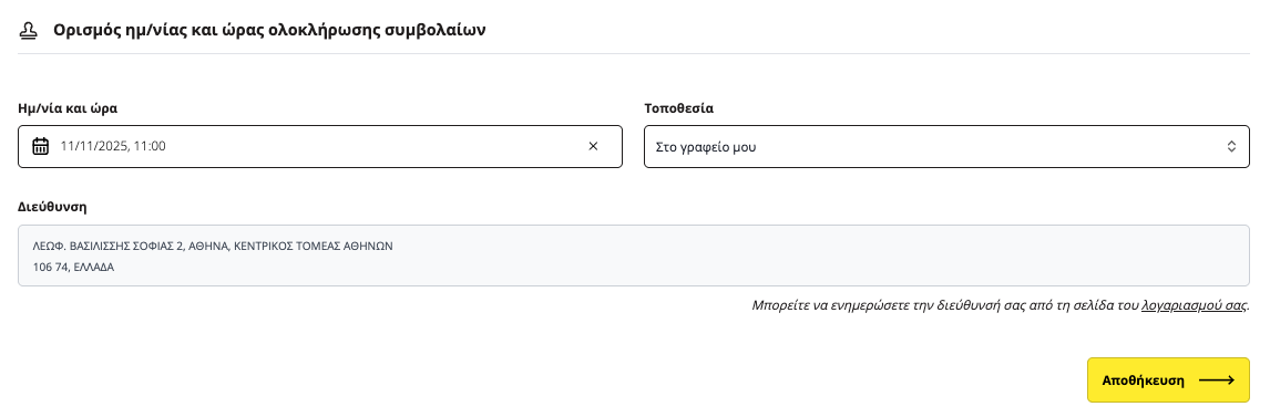Στην επόμενη οθόνη, επιλέξτε την ημερομηνία, την ώρα και την τοποθεσία για την ολοκλήρωση υπογραφής συμβολαίων.
