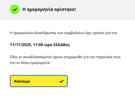 Θα λάβετε σχετική επιβεβαίωση. Όλοι οι συμμετέχοντες θα λάβουν αυτοματοποιημένη ειδοποίηση με email που θα τους ενημερώνει για την ημερομηνία και ώρα ολοκλήρωσης συμβολαίων, καθώς και σχετικές υπενθυμίσεις πριν το ραντεβού.