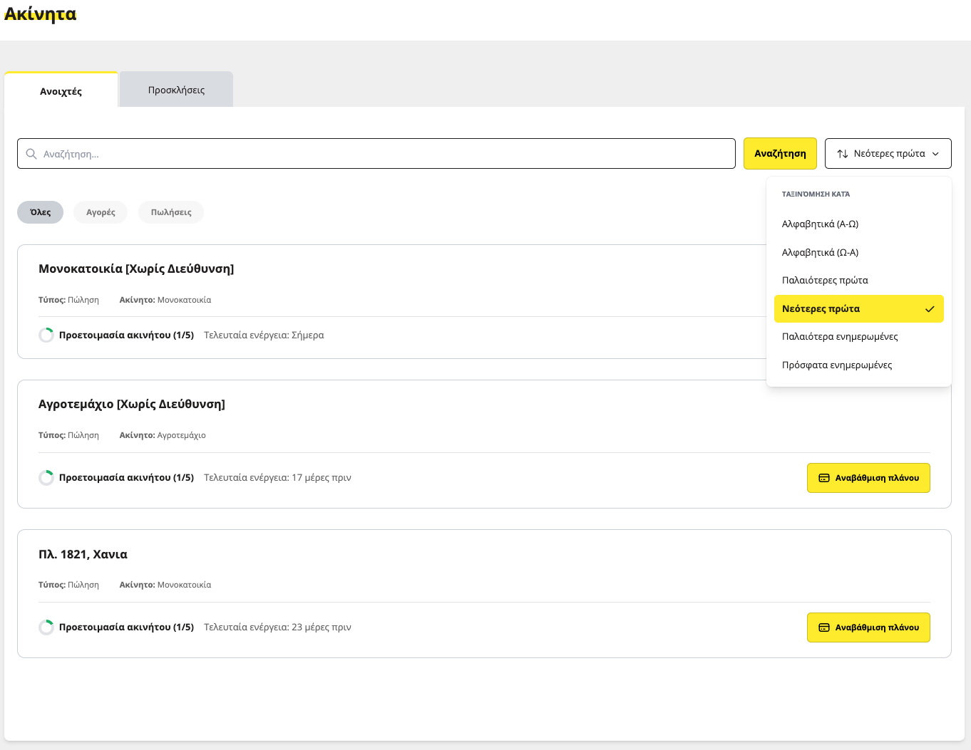 Εδώ βρίσκεται η λίστα με όλα τα ακίνητα που έχετε ήδη καταχωρήσει. Από εδώ μπορείτε να παρακολουθήσετε την πρόοδο πώλησης κάθε ακινήτου και να έχετε την πλήρη εικόνα όλων των εκκρεμοτήτων και των βημάτων που πρέπει να ακολουθήσετε για την ολοκλήρωση της πώλησης.