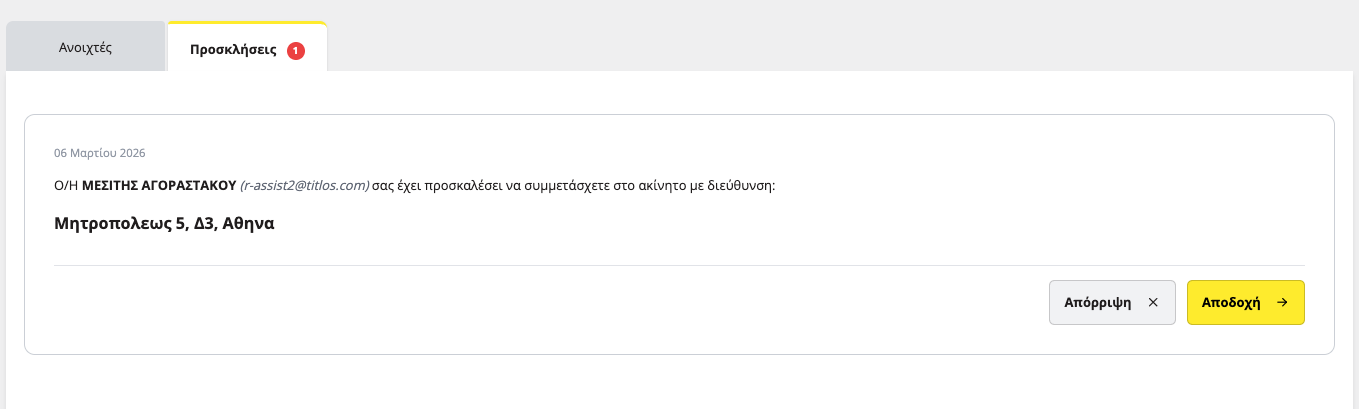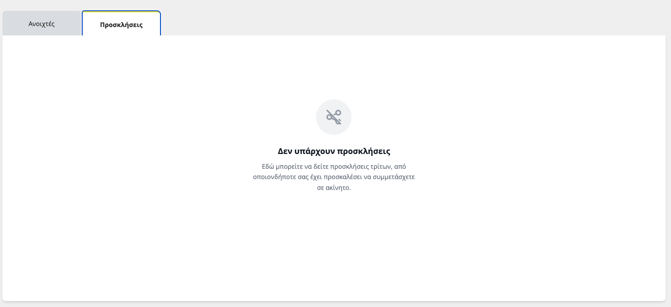 Εδώ βρίσκονται όλες οι ανοιχτές προσκλήσεις που έχεις λάβει από οποιονδήποτε σε έχει καλέσει για συμμετοχή σε αγοραπωλησίες στην titlos.com. Όταν δεν υπάρχει κάποια πρόσκληση η καρτέλα αυτή θα είναι κενή.