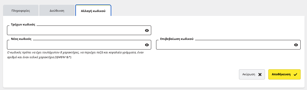 Για να αλλάξετε τον κωδικό σας, μεταβείτε απευθείας στη σελίδα Αλλαγή κωδικού εισάγετε τον τρέχοντα κωδικό, προσθέτετε νέο, επιβεβαίωση και Αποθήκευση.